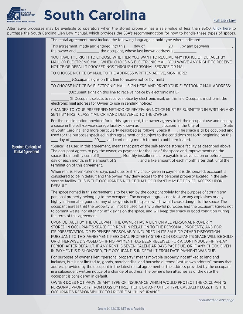 The South Carolina Self Storage Association, together with the national Self Storage Association, has achieved several legislative successes to protect and improve the state's business environment. Aside from lien law revisions, South Carolina also allows storage facilities to obtain a limited insurance license for the sale of tenant insurance.